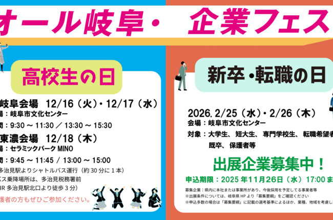 2/26にじゅうろくプラザにて開催されるオール岐阜企業フェスに参加します。転職・就職をお考えの方、製造・食品に興味のある方、お気軽にブースまでお越しください!県内最大級の合同企業説明会「オー